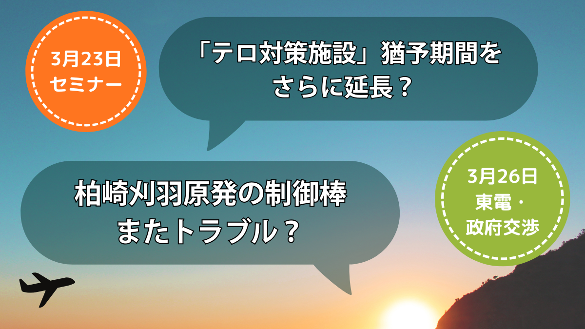 「テロ対策施設」猶予期間のさらなる延長、相次ぐ柏崎刈羽原発の制御棒トラブルについて、セミナー(3/23)と東電・政府交渉(3/26)開催