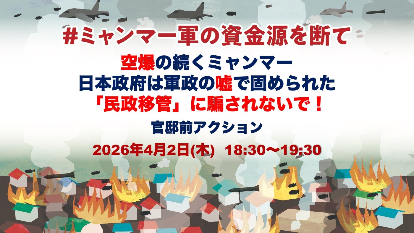 大国の横暴により各地で戦争や紛争が増える中、ミャンマーに関する世界の関心は高まっているとは言えない状況にあります。私たちは、ミャンマー軍政が今も、人々にもたらしている苦難を忘れていないことを示し、また、日本政府が「民政移管」に騙されることなく「情勢改善に向けた働きかけの強化」を具体化することを求め、官邸前でアピールを行います。ぜひ、ご参加ください。