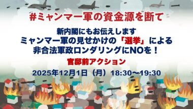 【12/1 官邸前アクション報告】新内閣にもお伝えします―ミャンマー軍の見せかけの「選挙」による非合法軍政ロンダリングにNOを!