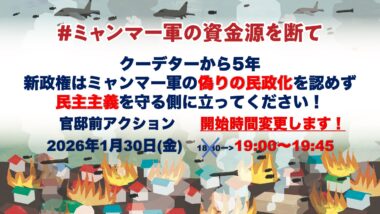 【1/30 官邸前アクション】クーデターから5年―新政権はミャンマー軍の偽りの民政化を認めず民主主義を守る側に立ってください!