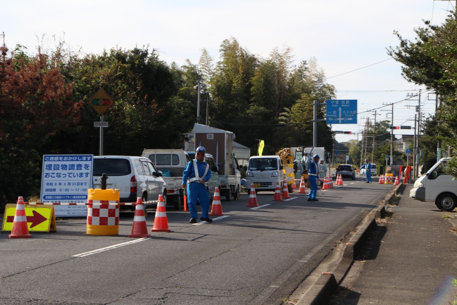 白子町にはいると、道路上で測量をしていました。また少し行くと、道路工事のようなことをしているところがありました。開削工法のルートです。