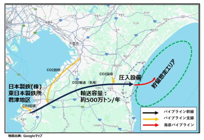 「首都圏CCS事業」とは、日本製鉄君津製鉄所から発生するCO2を、パイプラインを通して木更津市、袖ヶ浦市、市原市、長柄町、茂原市、白子町、九十九里町と千葉県を横断して運び、九十九里町沖の海底地下に貯蔵するというものです。将来的には製鉄所だけでなく、広く京葉臨海工業地帯からCO2を回収する計画です。