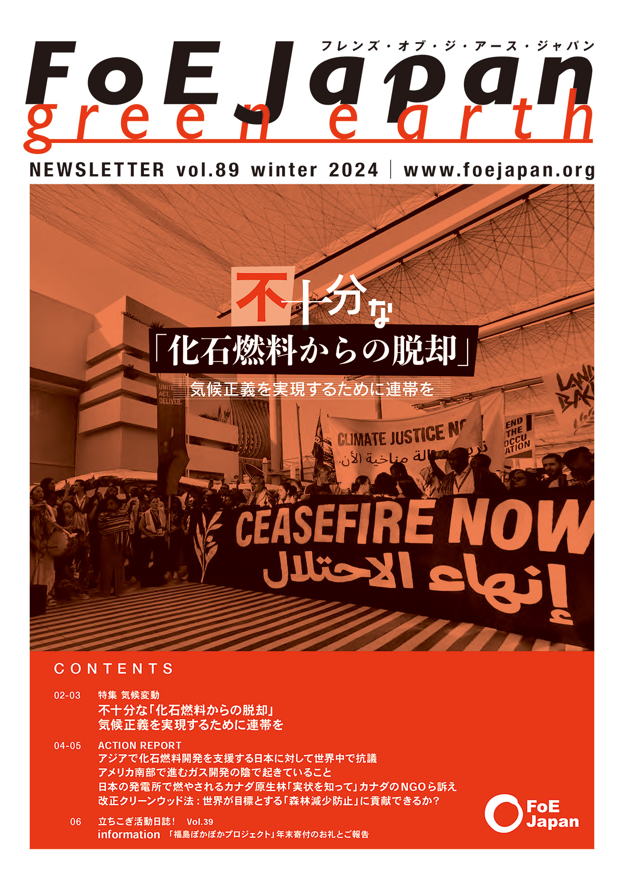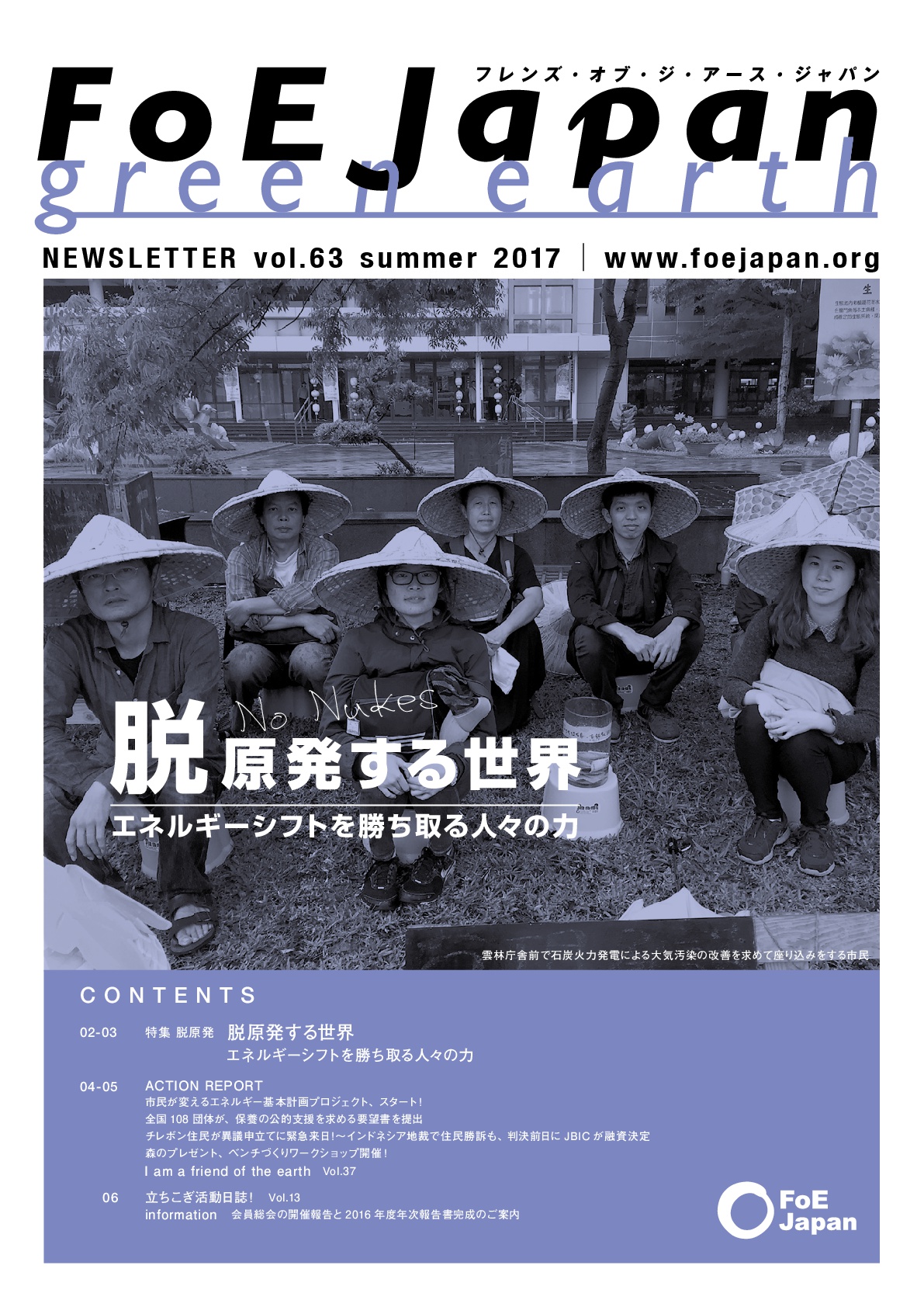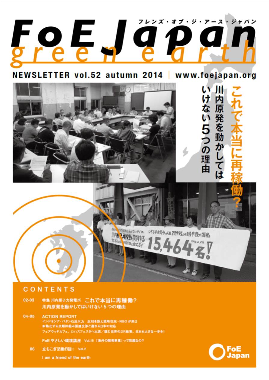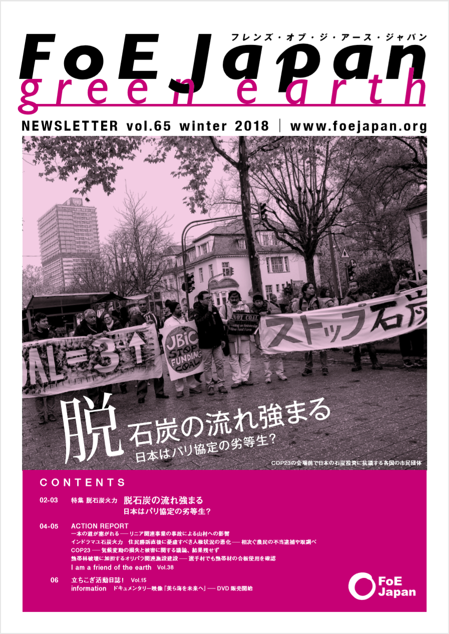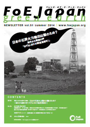 Action Report JBIC「異議申し立て制度」を考えるシンポジウムを共催/フィリピン石炭火力発電所に「NO!」求められる慎重なJBICの融資検討/「サハリン環境ウォッチ」リシツィン氏環境省庁と意見交換/容器包装リサイクル法の改正を求める全国ネットワークに参加/「つくって見よう!ソーラークッカー」セミナー開催/3.9%CO2吸収源としての日本の森林 ▼FoEJ Diary