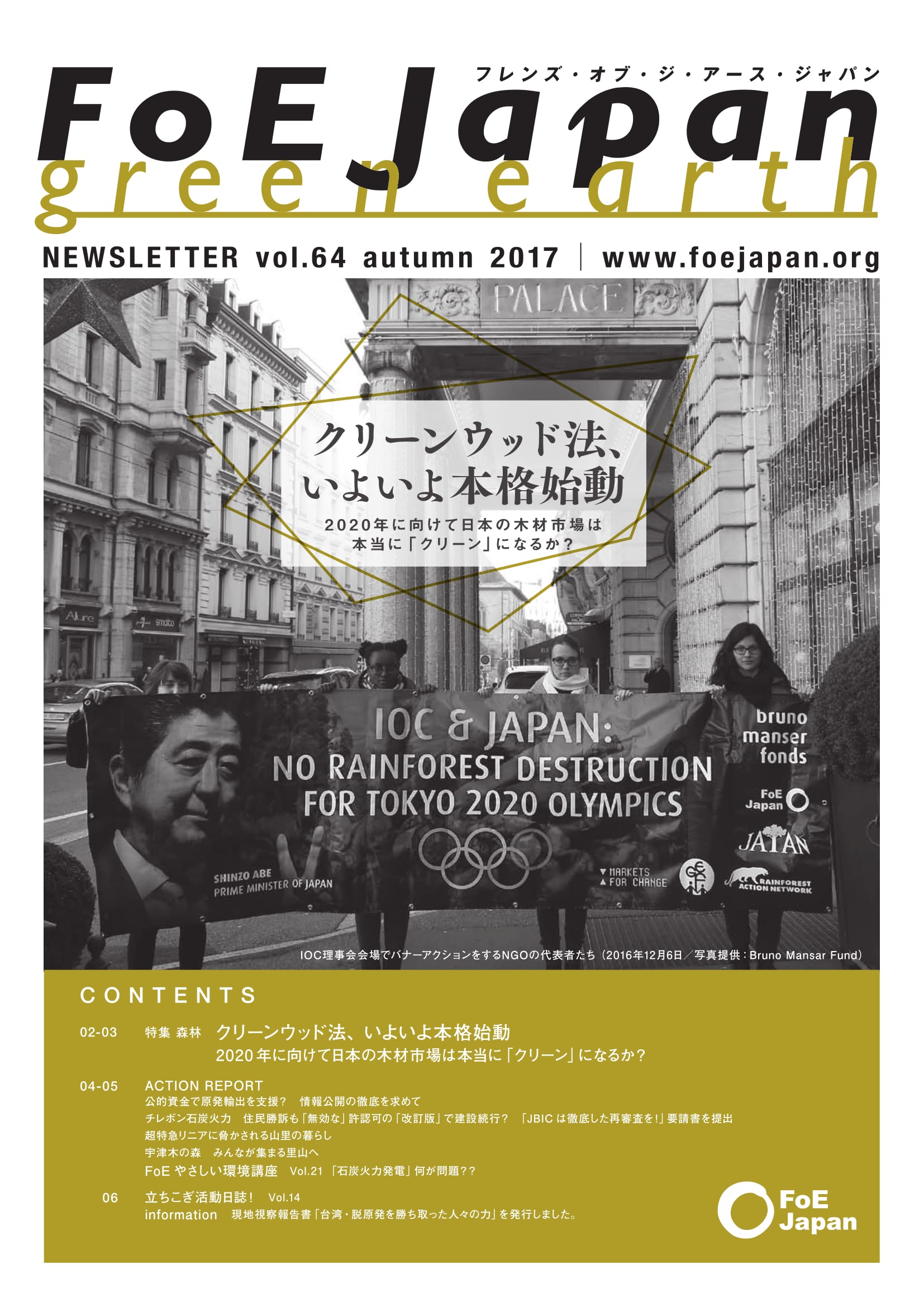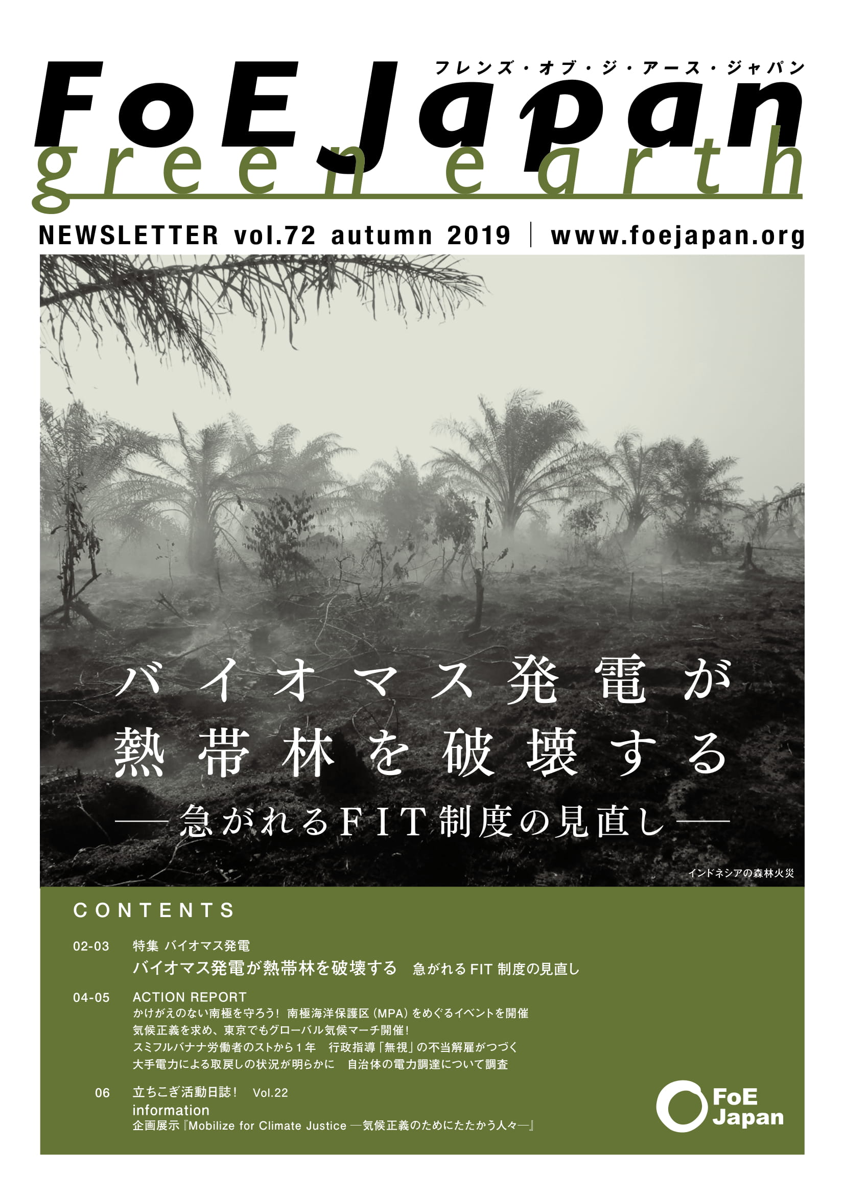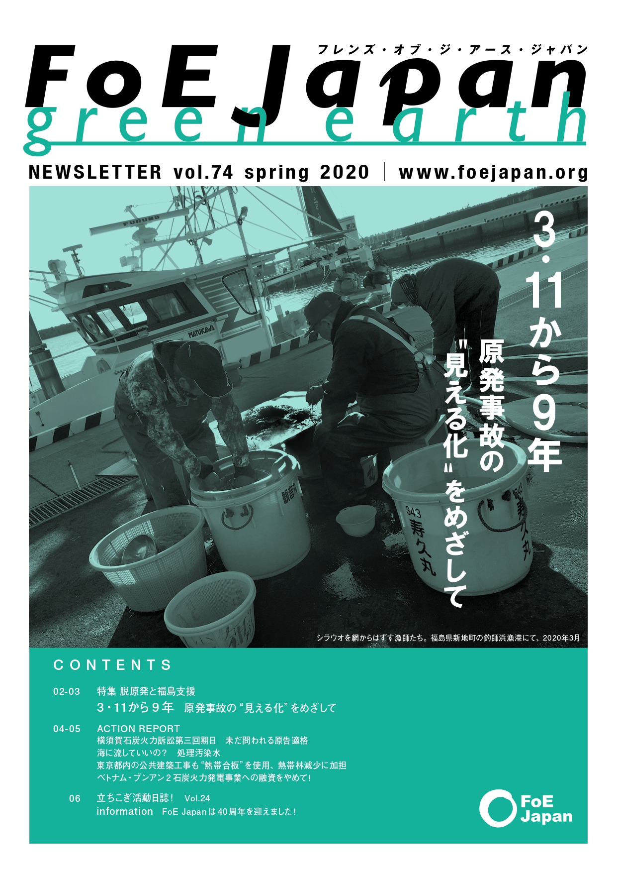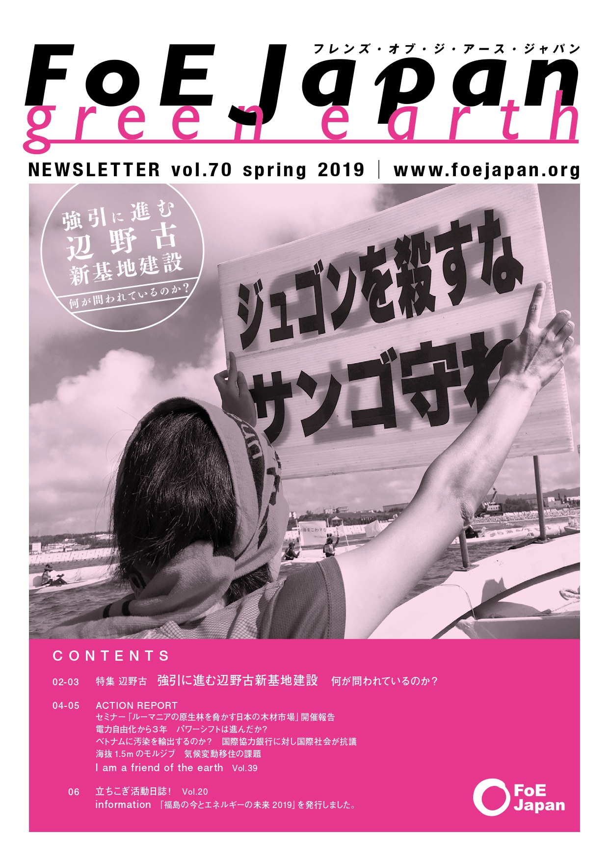 Action Report JBIC「異議申し立て制度」を考えるシンポジウムを共催/フィリピン石炭火力発電所に「NO!」求められる慎重なJBICの融資検討/「サハリン環境ウォッチ」リシツィン氏環境省庁と意見交換/容器包装リサイクル法の改正を求める全国ネットワークに参加/「つくって見よう!ソーラークッカー」セミナー開催/3.9%CO2吸収源としての日本の森林 ▼FoEJ Diary