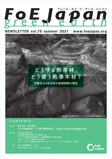 Action Report 国際協力銀行が異議申し立て手続き案を発表/日本の森を育成するために-間伐材を使った紙/地元を無視したロシア・サマルガ川の森林開発 先住民族団体と公開セミナー開催/太陽光発電所プロジェクト開始 ▼FoEJ Diary