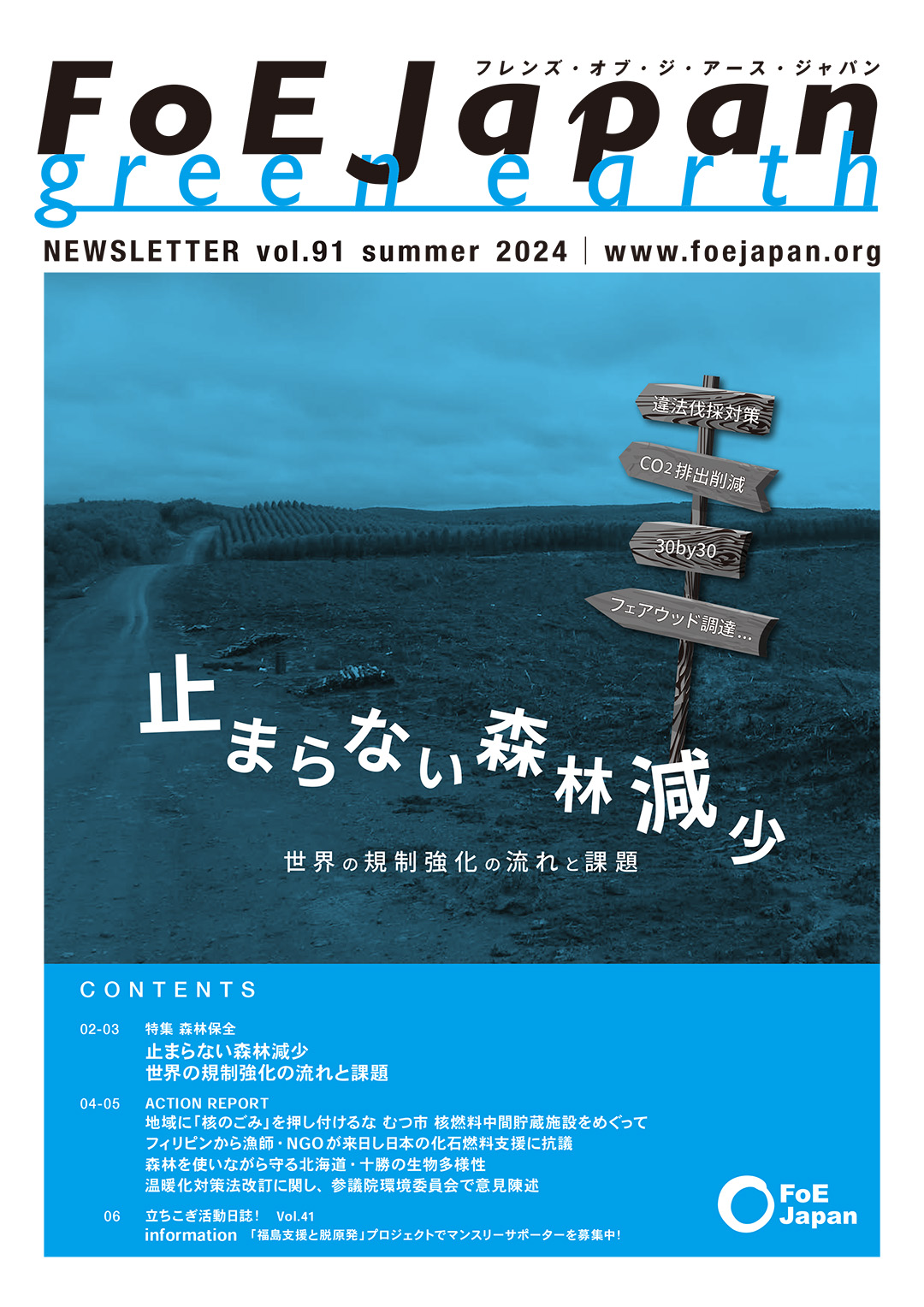 地域に「核のごみ」を押し付けるな むつ市 核燃料中間貯蔵施設をめぐって/フィリピンから漁師・NGOが来日し、日本の化石燃料支援に抗議/森林を使いながら守る 北海道・十勝の生物多様性/温暖化対策法改訂に関し、参議院環境委員会で意見陳述