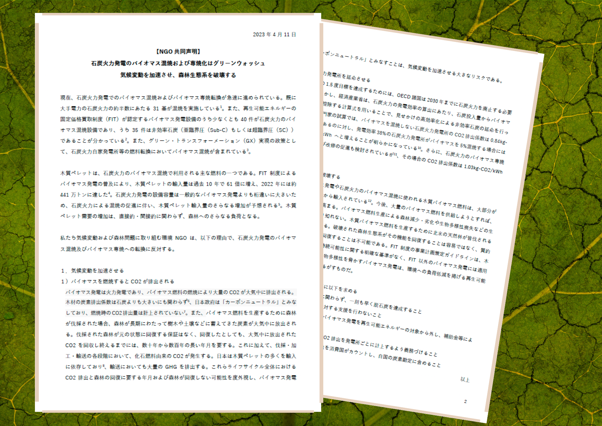バイオマス燃料の燃焼に関するGHG排出に関しては、森林の減少・劣化によるCO2排出もしくは燃焼におけるCO2排出のどちらかが評価されるべきである。前者は、その状況の把握や評価が難しいが、現実には、生産地では、森林の皆伐も含む森林減少・劣化の事例も報告されている。森林減少・劣化の事例も報告されている。