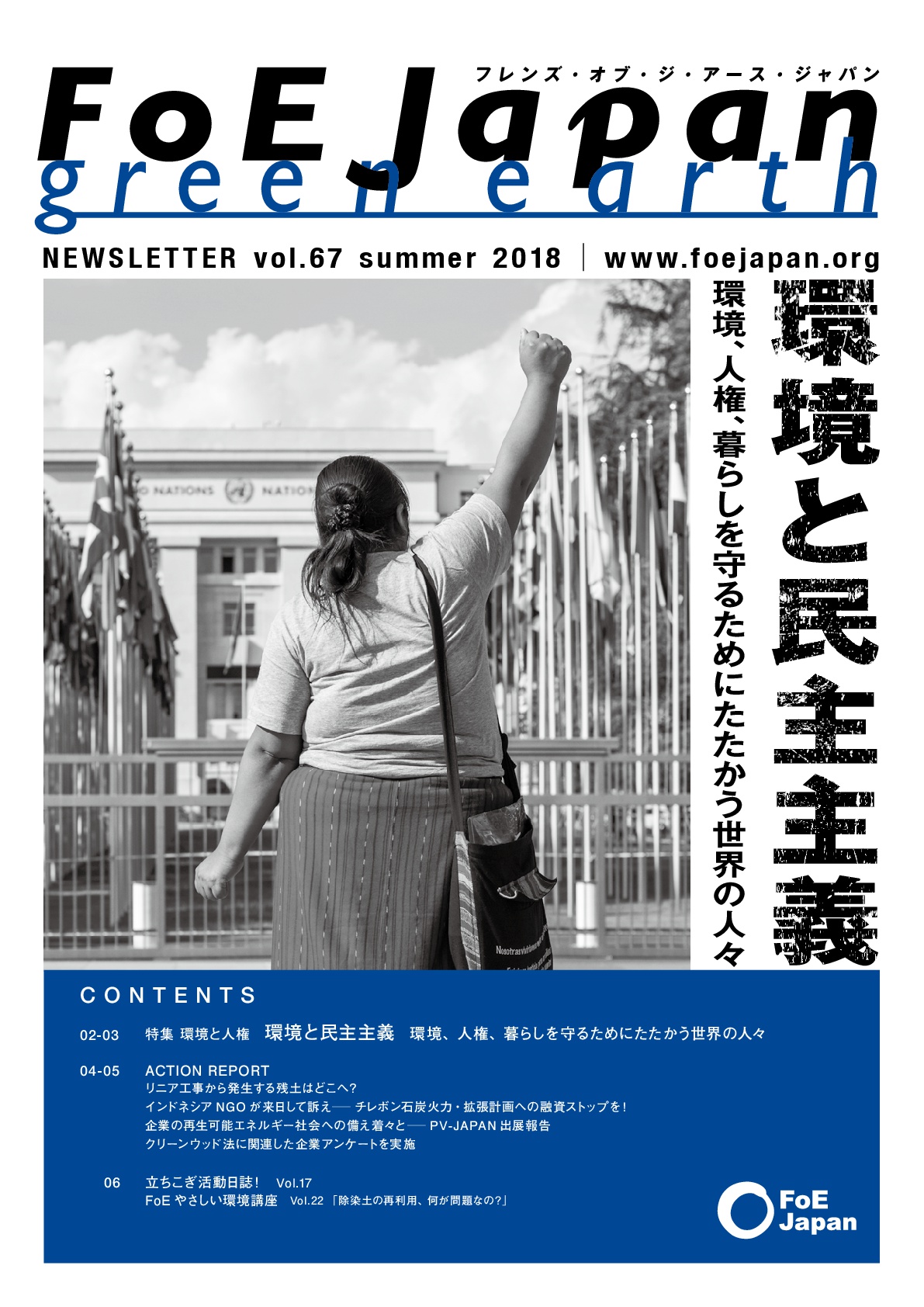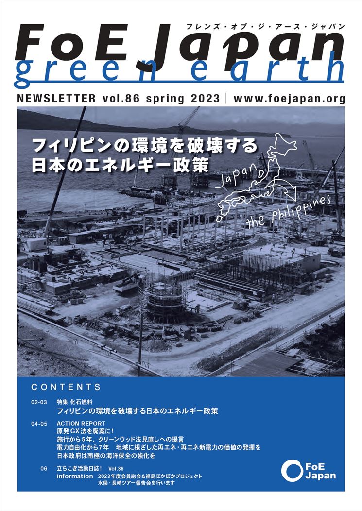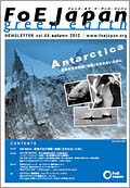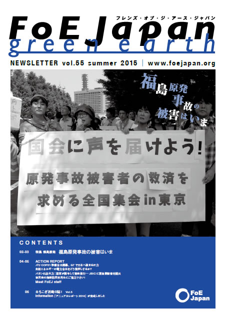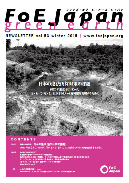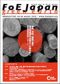 Action Report JBIC「異議申し立て制度」を考えるシンポジウムを共催/フィリピン石炭火力発電所に「NO!」求められる慎重なJBICの融資検討/「サハリン環境ウォッチ」リシツィン氏環境省庁と意見交換/容器包装リサイクル法の改正を求める全国ネットワークに参加/「つくって見よう!ソーラークッカー」セミナー開催/3.9%CO2吸収源としての日本の森林 ▼FoEJ Diary
