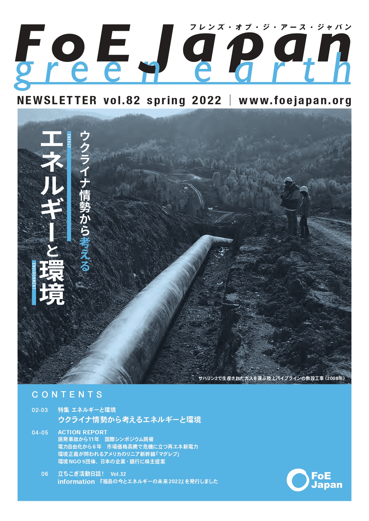 Action Report 国際協力銀行が異議申し立て手続き案を発表/日本の森を育成するために-間伐材を使った紙/地元を無視したロシア・サマルガ川の森林開発 先住民族団体と公開セミナー開催/太陽光発電所プロジェクト開始 ▼FoEJ Diary